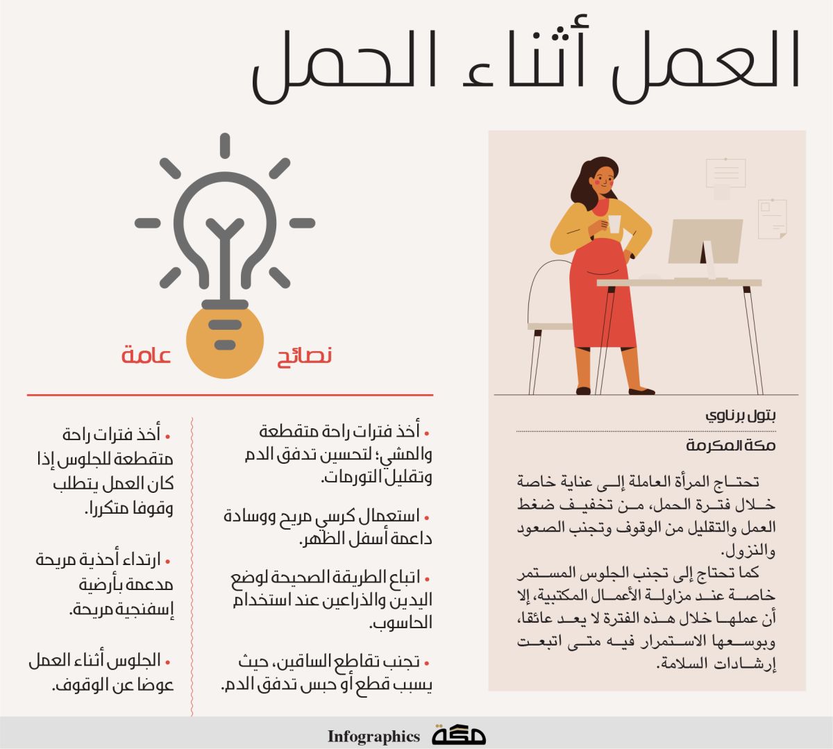 كما تحتاج إلى تجنب الجلوس المستمر خاصة عند مزاولة الأعمال المكتبية، إلا أن عملها خلال هذه الفترة لا يعد عائقا، وبوسعها الاستمرار فيه متى اتبعت إرشادات السلامة.