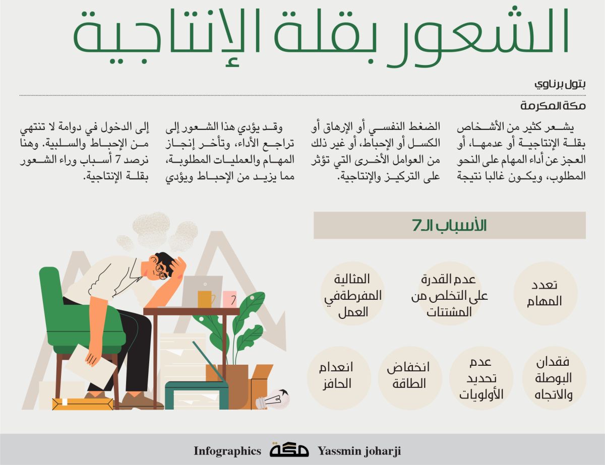يشعر كثير من الأشخاص بقلة الإنتاجية أو عدمها، أو العجز عن أداء المهام على النحو المطلوب، ويكون غالبا نتيجة الضغط النفسي أو الإرهاق أو الكسل أو الإحباط، أو غير ذلك من العوامل الأخرى التي تؤثر على التركيز والإنتاجية.