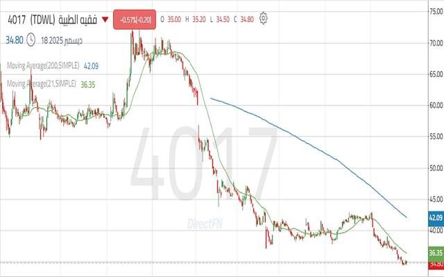 مباشر للأبحاث: يتداول سهم فقيه الطبية داخل اتجاه هابط واضح على الإطار الزمني اليومي، وسط غياب للقوة الشرائية وتداول السعر دون المتوسط المتحرك.