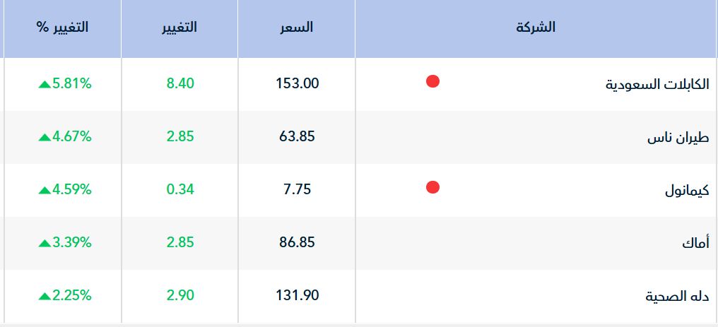 فى المقابل شهد 32 سهمًا أداءًا إيجابيًا، بصدارة سهم " الكابلات السعودية" الذى ارتفع بنسبه 5.18%، تلاه سهم " طيران ناس" بارتفاع نسبته 4.67%.