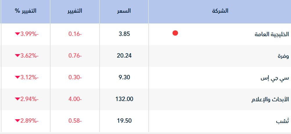 وعلى مستوى الأسهم ، شهد 226 سهماً أداءً سلبيًا، تصدرها " الخليجية العامة" الذي هبط 3.99%، تلاه سهم "وفرة" بتراجع نسبته 3.62%.