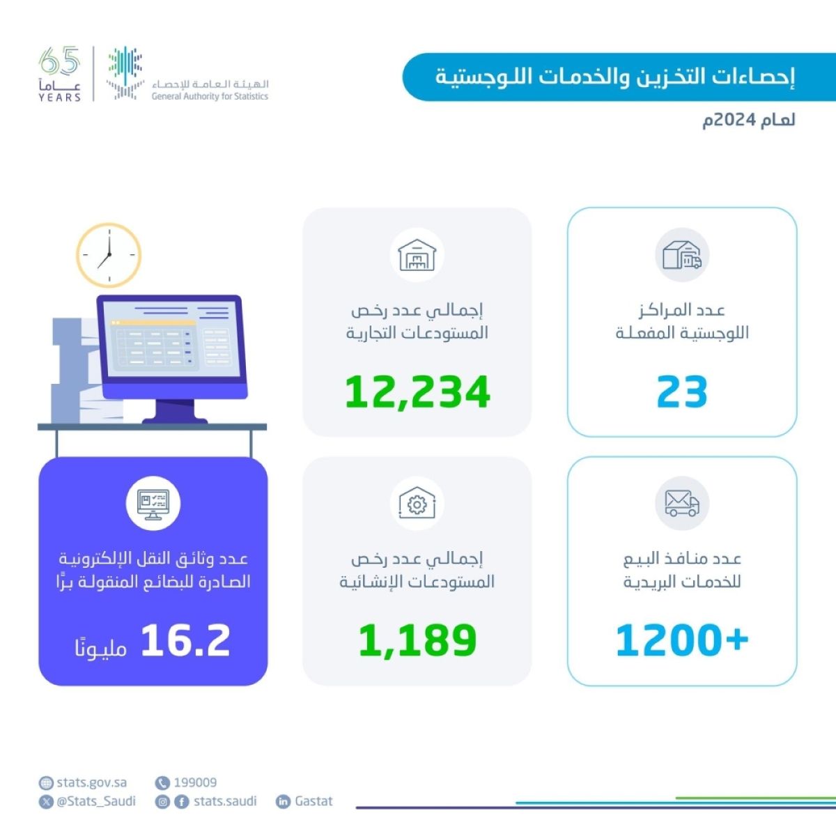 وبلغ إجمالي عدد المستودعات التجارية المرخصة 12,234 مستودعا بمساحة تجاوزت 22 مليون م2، فيما بلغ عدد المستودعات الإنشائية 1,189 مستودعا بمساحة بلغت 7.5 ملايين م2.